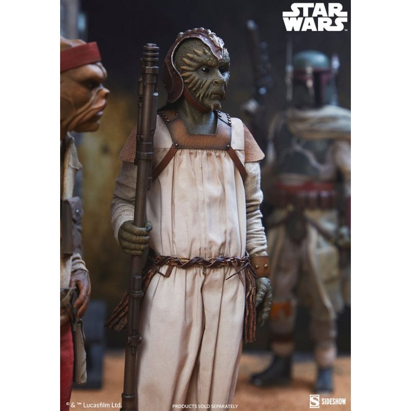 Sideshow presents the Klaatu™ Sixth Scale High-End Collectible Figure, an officially licensed Star Wars™ collectible ready to spend his days in your palace.Klaatu is a green-skinned Nikto, or Kadas'sa'Nikto, a species distinct for their scaly skin and symmetrical facial horns. A gambler and barge repairman, he is known to fans as an enemy of Luke Skywalker, and was disarmed by the Jedi at the Great Pit of Carkoon. As the destroyed barge crashed into Tatooine's sand dunes, this hardened warrior displayed loyalty to his host by remaining aboard.Inspired by the character's appearance in Return of the Jedi™, this fully articulated, highly poseable high-end Star Wars figure wears tailored fabric clothing accurate to his on-screen ensemble. His outfit consists of a tan vest, trousers, and hood, as well as armor befitting a henchman in Jabba the Hutt's entourage. The Klaatu™ Sixth Scale High-End Collectible Figure also wears a belt laden with thermal detonators across his chest and includes a pair of relaxed hands and a pair of gripping hands for the vibrostaff accessory.The Klaatu™ Sixth Scale High-End Collectible Figure is the latest addition to Sideshow's Scum & Villainy line of high-end collectibles, which brings your favorite underworld denizens all the way from a galaxy far, far away to your nearest home barge. Keep your senses sharp and be on the lookout for more infamous characters in this delightfully dangerous series of limited-edition high-end figures.Set sail with the Klaatu™ Sixth Scale High-End Collectible Figure by Sideshow!