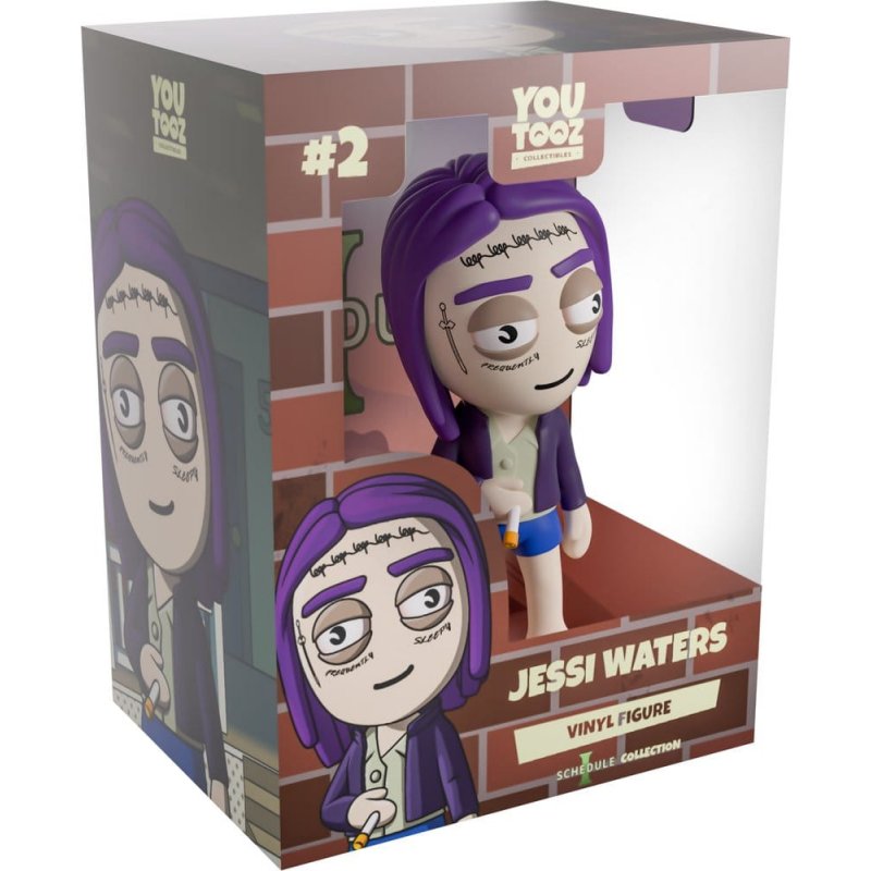 "Ooooh yeah"Have you got the stuff? You know the... good stuff??... Oh yeah, that's it! The Jessi Waters Youtooz! Standing at 4.5 inches tall and tilting her head to the side with deep purple hair hanging down to her shoulders, tattoos run down the side and across the forehead of her pale face while curving under each dark eye. Dressed in a dark blue jacket over her pale green shirt and short shorts, she holds a lit joint in her right hand and wears dark slides. The exterior of her packing sees her standing behind the white railing of the motel, while the interior looks onto a dusty pink desert with a single barren road running over a shaded hill. The protective sleeve is then covered in plants under hazy purple light as his figure can be seen through the large, clear window at the packaging's front. This collectible ships in a matte, embossed, protective outer sleeve and a custom-sized plastic protector for maximum protection during shipping.About Schedule 1:Schedule 1 is a simulation and management game developed and published by TVGS. Starting off as a small-time dealer, you must navigate your way through the grungy city of Hyland Point while growing your operation to become a true kingpin!
