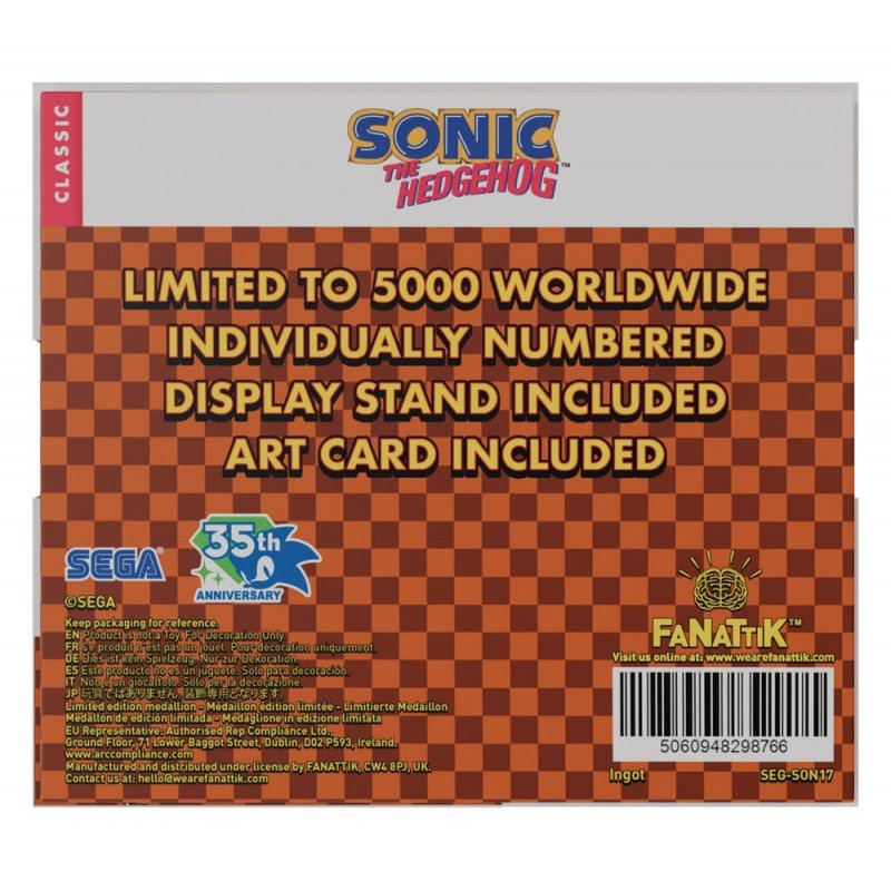 Released on the Sega Mega Drive (or Genesis for our North American friends) on 21st June 1991, the original Sonic the Hedgehog game quickly became one of the biggest games of all time, selling more than 40 million copies. This limited edition medallion in the shape of the logo from the first game measures 5 x 8 cm and is limited to 5,000 worldwide.