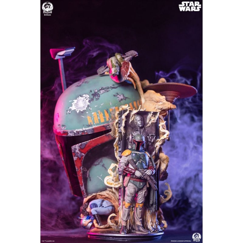 Premium Collectibles Studio is proud to present the Boba Fett - Fine Art Bust Deluxe Edition, a show stopping new collectible depicting the iconic bounty hunter introduced in the 1980 classic, STAR WARS: THE EMPIRE STRIKES BACK™.The Boba Fett Fine Art Bust stands over 20" high and centers on a faithful recreation of the bounty hunter's iconic helmet. Surrounding the helmet are beautifully sculpted scenes depicting important moments in this fan-favorite character's history including the tragedy of his childhood and his pivotal capture of the rebel, Han Solo. The bust also includes a recreation of Cloud City, the floating metropolis that serves as the setting for so many beloved story moments, wreathed in orange clouds that transition to an ethereal vision of the Mandalorian crest seeming to form in the atmosphere.The Deluxe Edition also includes an optional addition, a swap-out sculpted element depicting an older Boba Fett riding atop the fearsome Rancor beast.The Boba Fett - Fine Art Bust Deluxe Edition features LED light up features to add an extra sense of excitement and drama to this already staggering piece. The warm glow emanating from beneath the floors of the carbonite freezing chamber illuminates a highlight of this piece, a statue of the disquietingly stoic Boba Fett standing beside his frozen quarry.Bring home the ultimate prize and add the Boba Fett - Fine Art Bust Deluxe Edition by PCS to your Star Wars™ Collection today!Product size: 50 x 37 x 30 cmEdition Size: 250