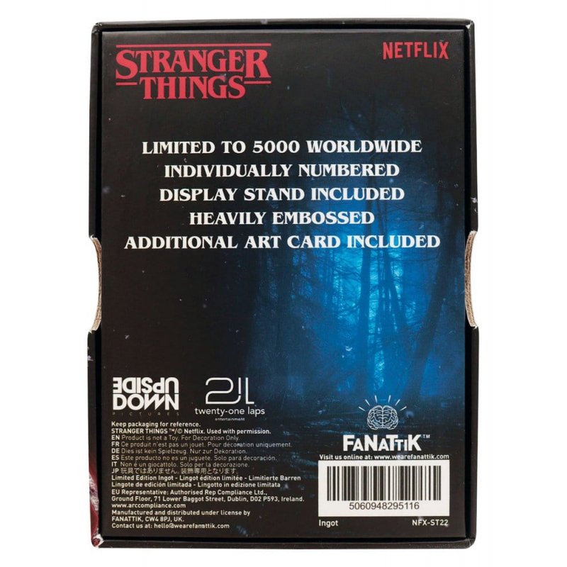 "Featuring the main villain from the latter seasons (or is he) on one side, and the stained glass window from the Creel house's front door on the reverse, this limited edition Vecna ingot highlights Jamie Campbell-Bower's prominence in Stranger Things 5.Measuring 90 x 60mm, each officially licensed ingot is individially numbered to the reverse as one of 5,000 worldwide, and is finished in an antique nickel plating.- Officially licensed - Limited to 5,000 - Individually numbered - Antique nickel plating - Size 90 x 60mm - Display stand included
