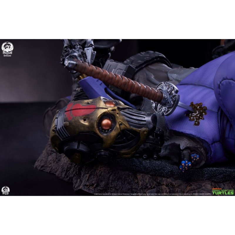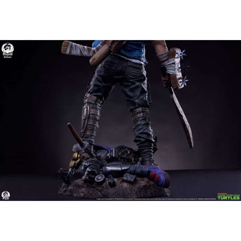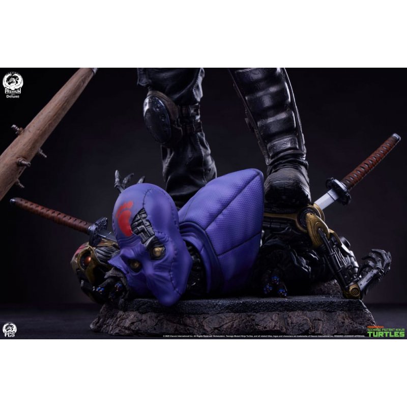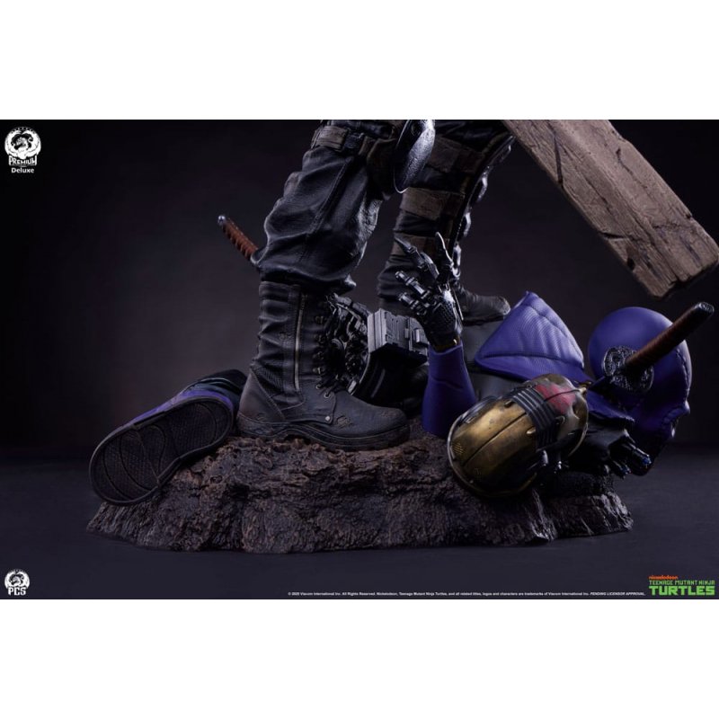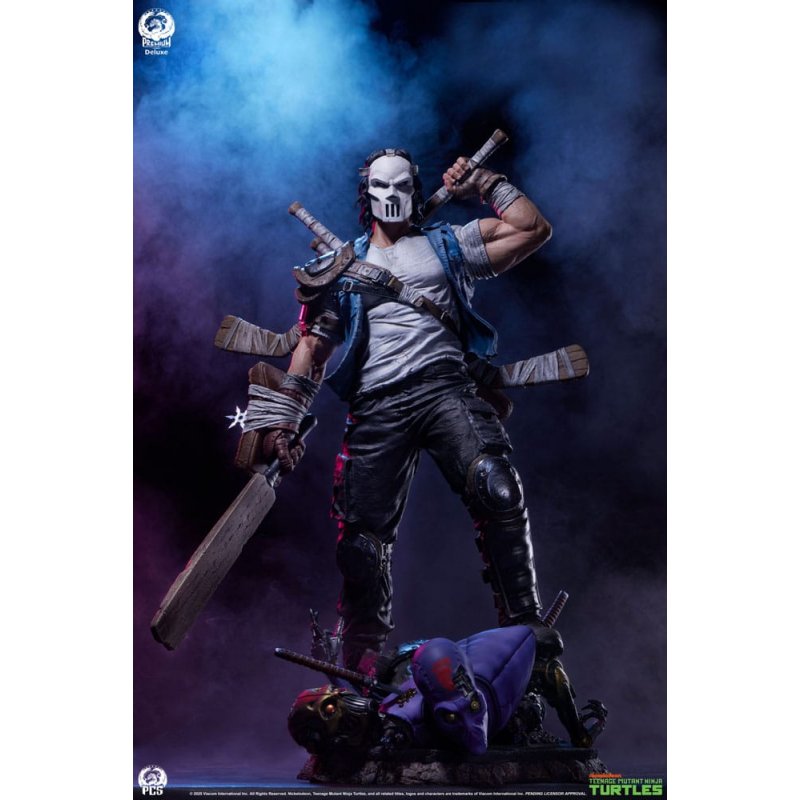 Premium Collectibles Studio presents the Casey Jones 1:3 Scale Statue - Deluxe Edition, bringing one of the turtles' oldest allies in the fight against the Foot Clan to the TMNT Legends 1:3 Scale Statue Collection. Designed by the Kucharek Brothers, this collection was inspired by the many iconic appearances of the Teenage Mutant Ninja Turtles over the last 35 yearsThe Casey Jones 1:3 Scale Statue measures 25.5" tall and nearly 17" wide depicting the masked vigilante standing victorious over a defeated robotic Foot Clan grunt. Armed with an arsenal of athletic accessories, Casey is ready for whatever the mean streets of NYC can throw at him. The heavily modified golf bag slung over his shoulder features life-like sculpted leather textures and is stuffed with heavily taped-up hockey sticks and baseball bats. His well worn clothing and battle damaged protective gear are indicative of his singular focus and commitment to brutal street justice.The Deluxe Edition includes a swap-out right arm wielding a battered cricket bat and equipped with a makeshift shield fashioned from a reinforced hockey glove and blocker. A trio of throwing stars are embedded in the blocker, showcasing its efficacy in the battle against the Foot Clan. The Deluxe Edition also includes an additional portrait to offer collectors even more display options.Casey's man-made and decidedly low-tech equipment stand in contrast to the defeated cybernetic Foot Clan soldier that comprises the bulk of the statue's base. The vibrant purple Foot uniform and exposed metallic endoskeleton underneath are beautifully painted to highlight these clashing methodologies.Add some slugging power to your TMNT Legends lineup and score the Casey Jones 1:3 Scale Statue - Deluxe Edition by Premium Collectibles Studio today!Limited to 350 pieces