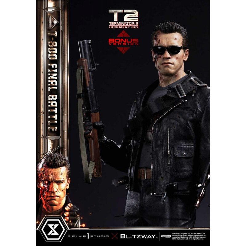 "Hasta la vista, baby" Prime 1 Studio is so proud to present yet again another astonishing collaboration with Blitzway. Limited to only 500pcs introducing the next entry to our Museum Masterline Series: The 1:3 Scale MMT2-02DXS T-800 Final Battle Deluxe Bonus Version from Terminator 2: Judgement Day! Prime 1 Studio and Blitzway have come together once again to deliver yet another statue of the highest quality and stunning accuracy of Arnold Schwarzenegger's Terminator from the groundbreaking sequel that came out more than 30 years ago! Set eleven years after the first movie, the sequel features a new Terminator unit, the T-800, which is sent back in time to protect John Connor from an advanced and more lethal Terminator, the T-1000, so that he may fulfill his role in the future battle against Skynet. This time, we are taking you back to the climax of the movie, the final battle between T-800 and T-1000 at the steel mill, bringing you a hyper-realistic screen-accurate depiction of a battle-damaged T-800. As usual, Blitzway masterfully sculpted this 29-inch-tall work of art. The fierce battle against the new and improved T-1000 has caused substantial damage to the protagonist. Once again, breath-taking craftsmanship to recreate T-800 in all his menacing splendor from the final act: ripped flesh, revealing the endoskeleton underneath as well as the built-in LED illuminated right eye. Every aspect and detail of the outfit has been meticulously and masterfully replicated. Genuine black leather has been used to recreate the Terminator's outfit with masterful attention to detail. We are talking bullet holes, zippers, pockets, and buckles on the stunning biker jacket, accessorized with a textile cartridge belt. The torn pant-leg shows a glimpse of the exposed endo-leg underneath. Two right-arm parts allow you to display either the grenade launcher or the rod used to sever his left arm that got trapped in a set of heavy gears during the intense struggle with Skynet's assassin. T-800 Final Battle stands atop a steel-factory-themed base that is also LED-illuminated. At his feet is a chain hoist hook as well as up to twelve scattered bullets. The Deluxe Version comes with a multitude of additional parts, allowing you to expand the storytelling further as you see fit! An additional head-part featuring a half-damaged face fully showcases Arnold's facial features and intense gaze. An additional endo arm part can also be swapped with the damaged and broken arm part. We've also included stands for the head and endo arm parts. When you order the Deluxe Bonus version from our official store or any authorized distributor, you will receive a cool sunglasses as a Bonus part. To say that this absolute work of art is a must-have for any Terminator fans is an understatement. This highly detailed likeness sculpture of Arnold Schwarzenegger's T-800 is sure to satisfy any collector. Pre-order the MMT2-02DXS T-800 Final Battle Deluxe Bonus Version while you can, as quantities are only limited to 500 pieces. Product Specifications: - Statue Size approximately 29 inches tall [H:74.7cm W:32.6cm D:32.6cm] - Highly detailed likeness sculpture of Arnold Schwarzenegger - Sophisticatedly tailored and designed outfits - T-800 Endoskeleton themed-base - LED illuminated on Fully Damaged head and base - Genuine leather Jacket and Pants, Fabric T-Shirts - Two (2) Swappable head parts (Fully Damaged and Half Damaged) - Two (2) Swappable right-arm parts (Grenade Launcher and Rod) - Two (2) Swappable left-arm parts (Damaged Endo Arm and Full Endo Arm ) - Twelve (12) Grenade Launcher Bullets - One (1) Cartridge Belt - One (1) Chain Hoist Hook - One (1) Head Stand - One (1) Endo Arm Stand - One (1) Pair of Sunglasses [BONUS PART] Limited to 500 pieces. Please note: Due to the size of this item, additional shipping costs may apply. Apart from your location, the actual package size and weight is needed to determine those costs. Both are unknown at this point and may not be available until the product arrives in our warehouse.