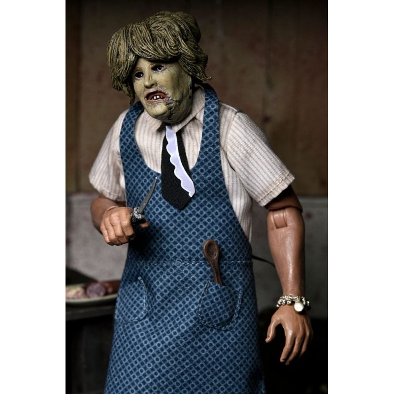 From Tobe Hooper's classic 1974 film The Texas Chainsaw Massacre, NECA brings you this retro-style action figure of Leatherface in his iconic Grandma look!The ruthless killer wears a creepy elderly lady mask, apron, and tailored fabric clothing inspired by vintage toy lines of the '70s and '80s. This fully articulated, 8-inch scale figure includes a plate of meat, spoon, knife, butcher cleaver, and long hammer.He is ready to cook, and you're for dinner!Comes in collector-friendly window box packaging.