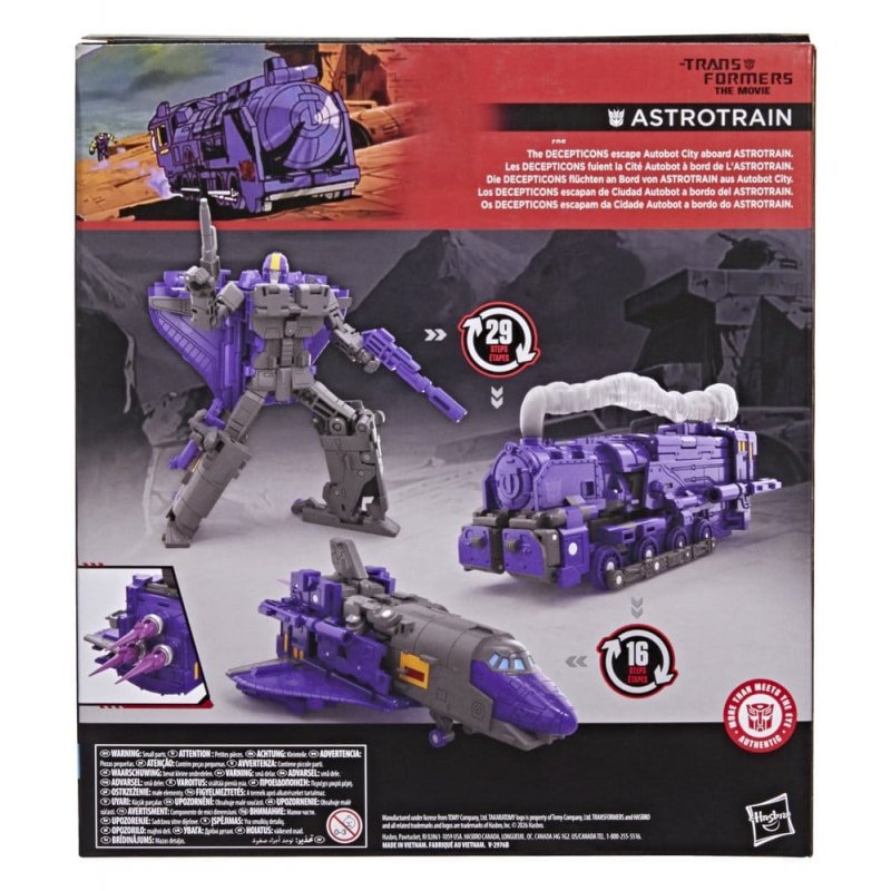Experience the epic action of The Transformers: The Movie with the Studio Series Astrotrain figure. The 6.75-inch (17 cm) figure converts from robot action figure to train mode in 29 steps and from train to space shuttle in 16 steps. With movie-inspired details, intricate poseability, and attachable accessories like blasters, blast effects, and even a trail of smoke for train mode, this Transformers Astrotrain action figure makes an awesome addition to any collection. Look for more Studio Series Transformers figures (sold separately, subject to availability) featuring favorite characters like Optimus Prime, Bumblebee, Megatron, and more to create a lineup that is - More Than Meets the Eye.