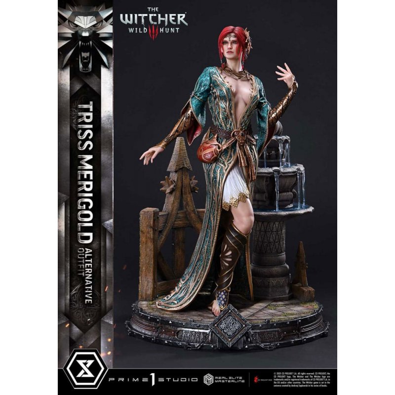 The sorceress emerges in vivid realism. Fierce battles, countless mysteries, and a romance that stirs the heart await in "The Witcher 3: Wild Hunt." From this acclaimed open-world RPG comes Triss Merigold Alternative Outfit, joining the Real Elite Masterline. As the leader of a clandestine resistance and a sorceress reunited with her former lover, Triss is brought to life in her DLC Alternative Outfit at 1/4 scale. Her flowing pose embodies both elegance and determination, with her head, right leg, and arms forming parallel and diagonal lines that create a visual rhythm. Her poised expression, drawn from the game's stunning graphics, strives to capture the sorceress at the height of her powers. Every detail is handled with meticulous craftsmanship, from her fiery red hair to her emerald green and gold robe. This piece of attire emanates the majesty and elegant strength that burns at the heart of one of The Witcher world's most iconic magic wielders. It is faithfully recreated here with its rich tones, botanical patterns, and woven textures sculpted with precision. The specially designed base, inspired by the DLC visual, features a fountain with clear water cascading down, weathered stone pavement, and a medallion at the front, all crafted to evoke the story's atmosphere. Through striking sculpt and paintwork, Triss is ready to heat up your Witcher collection with the poise and strength of heart that she is known for. Specifications: - The Witcher 3: Wild Hunt -Themed Base - 1 x Swappable Right Arm (Bare Hand)