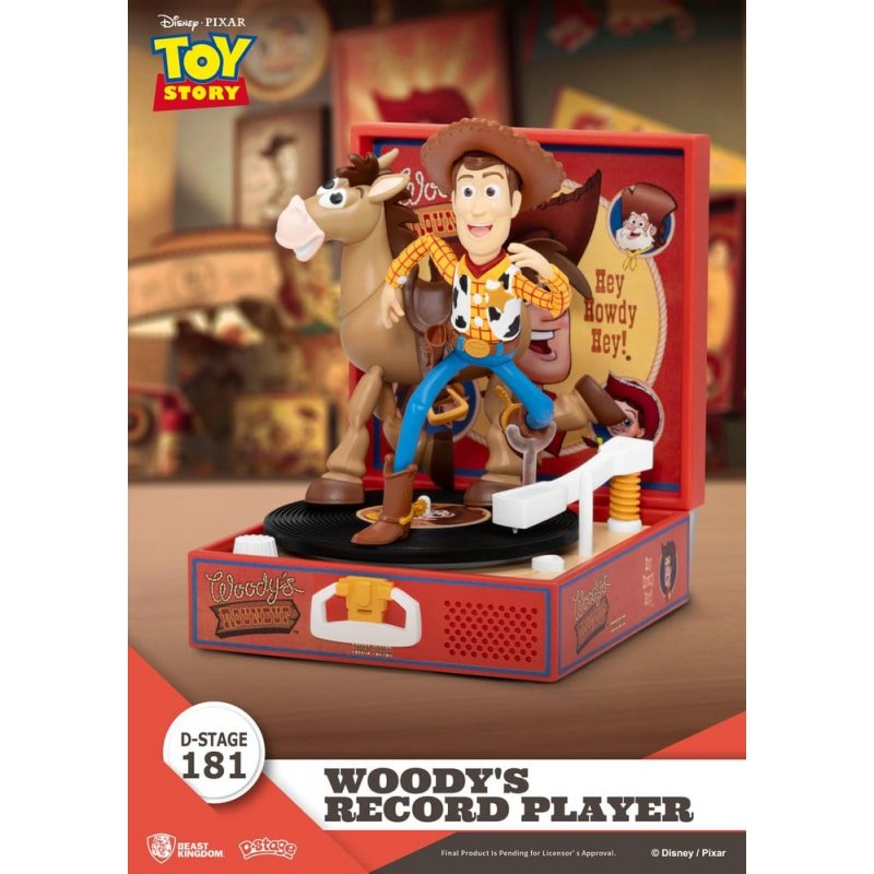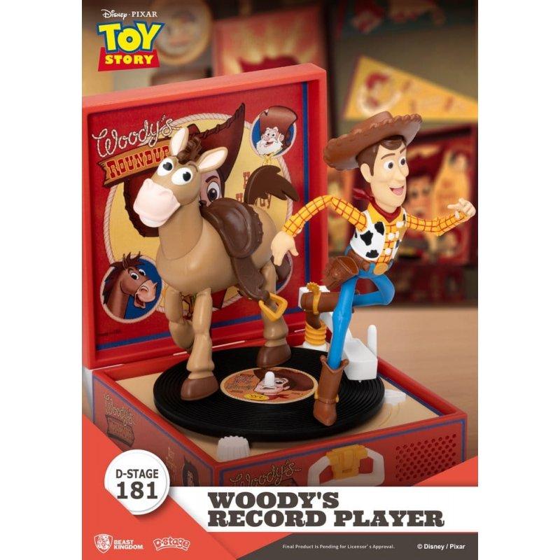 Beast Kingdom presents a new diorama from the D-Stage " record player Series " series, inspired by Toy Story. Set atop a nostalgic record player, this piece captures Woody and Bullseye charging forward together, evoking the joyful rhythm of childhood memories and adventure.High-quality 3D sculpting brings Woody's iconic smile and dynamic running pose to life, while Bullseye's lively expression and detailed saddle enhance their playful interaction. The scene is filled with movement and charm. The base features classic record player elements such as a vinyl disc, control knobs, and speaker details, complemented by Woody's Roundup-inspired artwork for a strong retro feel. Rich with hidden details from every angle, this diorama is a must-have for Toy Story fans.Bring DS-181 Woody's Record Player home and let nostalgia play on your display.Size: 13 cm