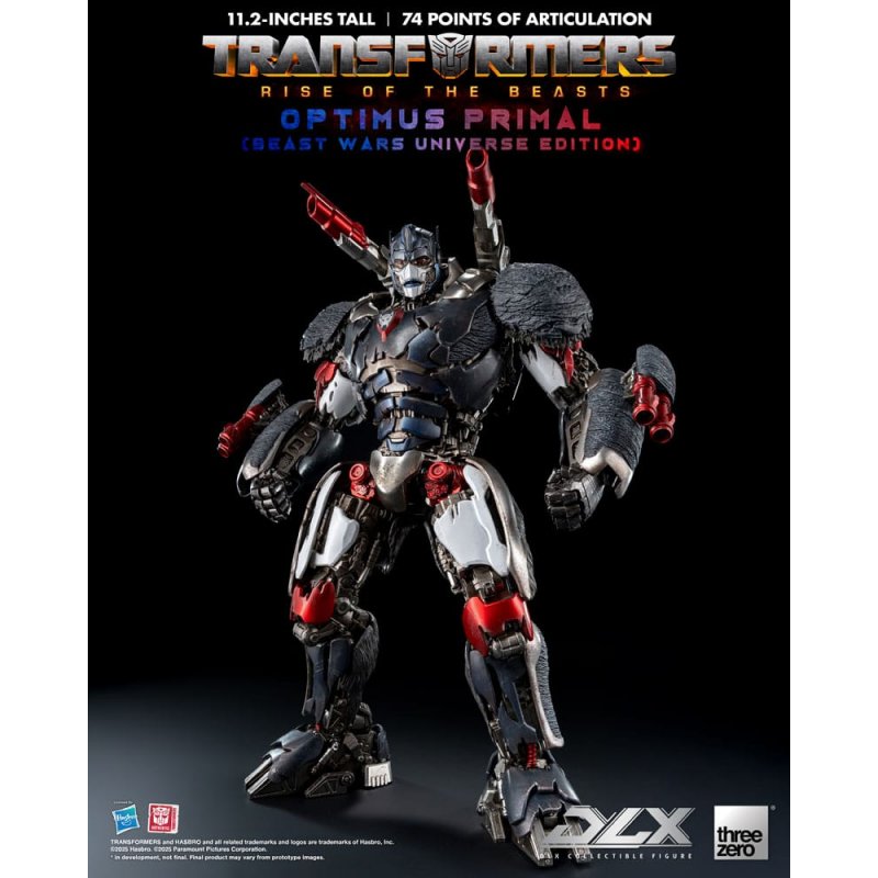 threezero is proud to announce DLX Optimus Primal (Beast Wars Universe Edition) based on the design from Transformers: Rise of the Beasts movie and inspired by the classic Beast Wars: Transformers character!Standing at approximately 11.2" (28.5 cm) tall, Transformers: Rise of the Beasts DLX Optimus Primal (Beast Wars Universe Edition) features Optimus Primal's signature red, blue and black color scheme, as well as the "Maximals" insignia on his chest, paying homage to his appearance as seen in the computer animated series!This is the first time threezero has introduced a "missile launcher" in its DLX collectible toy line! The Beast Wars Universe Edition includes a pair of Mega Blasters that can be mounted on his back and adjusted for angle, each can launch missiles to enhance playability. Additionally, he includes a pair of Wrist Cannons featuring a built-in magnetic design, allowing them to be attached to the arms.Transformers: Rise of the Beasts DLX Optimus Primal (Beast Wars Universe Edition) features three interchangeable faces that allow you to showcase the changes across different modes, providing versatility in your display options. The LED-illuminated eyes (requires AG13 batteries x 2, batteries not included) bring figure to life.Also included are two Cyber Blades that can combine into a single weapon by using the metal chain to connect them. Additionally, PVC "fur" has been added to the shoulder armor, perfectly replicating the silhouette from the computer animation.FEATURES- Officially Licensed by Hasbro and TakaraTomy - Approximately 11.2 inches (~28.5cm) tall - Approximately 74 points of articulation, having the most points of articulation in the DLX collectible toy line - The first time threezero has introduced a "missile launcher" in DLX collectible toy line - Detailed weathered paint application - LED-illuminated eyes - Die-cast metal frame design with advanced articulation range - A pair of Mega Blasters with missile launcher capabilities, and a pair of Wrist Cannons with built-in magnetic attachments - Cyber Blades can combine into a single weapon - Metal chain included for connecting the weapons - Interchangeable faces - PVC fur added to shoulder armor to replicate the silhouette from the computer animation - Various interlinking functions for arm, leg, and body movementsACCESSORIES- 2 pcs of Cyber Blades - 1 pair of Wrist Cannons - 1 pair of Mega Blasters with Missiles - 1 pc of Metal Chain - 1 pc Connection part between Cyber Blades - 2 pc of Connection part between Cyber Blade and DLX Optimus Primal's back - 3 pcs of interchangeable face parts - 4 pairs of interchangeable hands: one (1) pair of Fists, one (1) pair of Relaxed Hands, one (1) pair of Action Hands, and one (1) pair of Weapon Holding Hands - 1 pc of DLX action standLED Light-up FEATURES*- EyesRequires 2x AG13 batteries (not included).