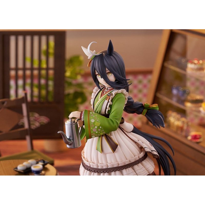 From "Umamusume: Pretty Derby" comes a scale figure of Manhattan Cafe in a traditional Japanese outfit. Dressed in her Willow-Green Evening outfit from a Japanese confectionery shop, the figure features Manhattan Cafe gently preparing a cup of coffee. Her matcha-green kimono, frill apron and boots come together to create the perfect blend of Japanese and Western aesthetics, further enhancing the adorable Umamusume's graceful charm. Details such as the soft texture of the apron, Manhattan Cafe's carefully braided hair and cat motifs scattered throughout the outfit have all been carefully reproduced in figure form. Be sure to add the adorable Manhattan Cafe to your collection for a quiet and relaxing moment together!