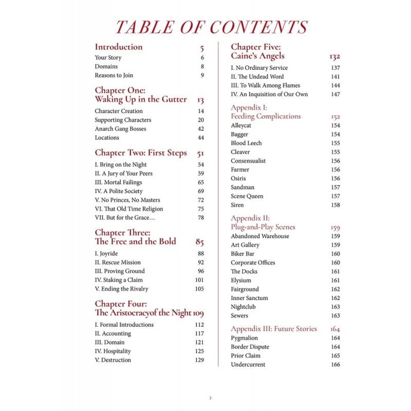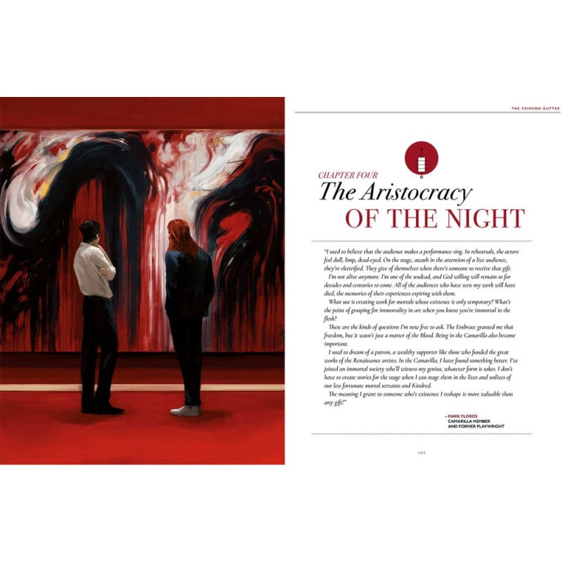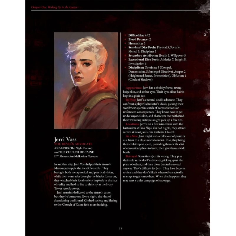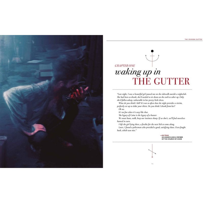 Some editing errors occurred with the Supporting Characters section. The full PDF has already been updated, but fans with the printed book may find the updated character profiles (specifically the Disciplines sections) here.You've been Embraced, brought into the night and left to fend for yourself with your coterie. Now what?The Crimson Gutter provides a starter chronicle, designed to help novice or experienced Storytellers run any introductory game of Vampire: The Masquerade. The Crimson Gutter chronicle introduces core concepts during play such as feeding, the sects (Anarchs, Camarilla), and the Masquerade itself while giving the players' characters a chance to carve a niche for themselves among the Kindred.The 21 highly adaptable stories contained within can be played in isolation or strung together to form multiple arcs of a chronicle. Experienced Storytellers can easily adapt these stories to their own chronicles, drawing from them to fill an evening of play or adapting whole story arcs. Also included is a city setting adaptable to any fictional or real city including eight recurring locations and more than 20 recurring Storyteller characters.Features- 21 stories suitable for both new and experiences Storytellers - Presents Church of Caine as major faction alongside Camarilla and Anarch - Three appendices provide additional fodder for dropping in feeding complications, fleshing out locations, and future stories. - A city setting adaptable to any fictional or real city - including eight recurring locations and more than 20 recurring Storyteller charactersMature Content Warning: Contains graphic and written content of a mature nature, including violence, sexual themes, and strong language. Reader discretion is advised.